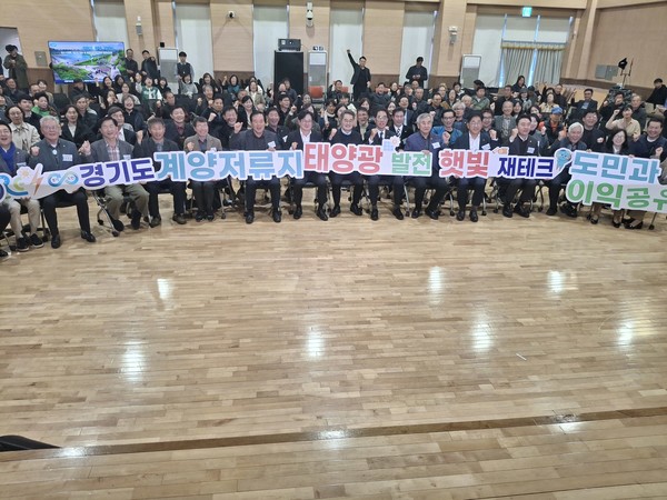 이날 김 지사는 김포시 고촌읍행정복지센터에서 ‘계양천(저류지) 착공 및 공공RE100 도입 현장 설명회’를 개최했다. 김 지사는 계양천 정비사업이 홍수예방은 물론 기후대응과 수익창출을 꾀할 수 있는 1석3조 사업이라며 확실히 추진하겠다고 다짐했다.