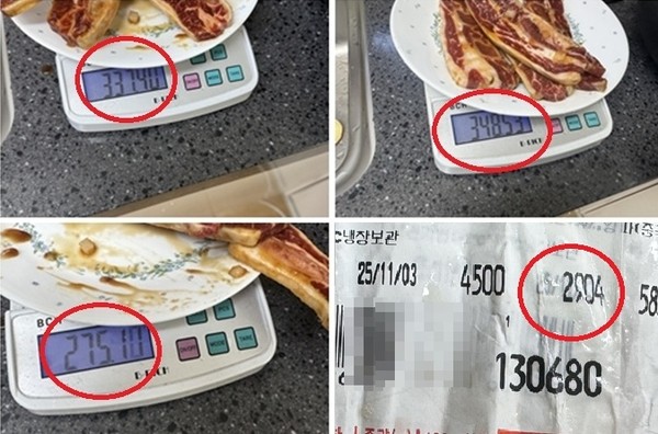 URL복사 기사공유하기 스크랩 프린트 메일보내기 글씨키우기 전북 군산시 수송동에 사는 서 모(여)씨는 대형마트에서 LA갈비 약 3kg를 13만 원에 구매했지만 집에 와서 무개를 재보니 고기는 1kg도 안 된다며 황당해했다. 실제로 서 씨가 첨부한 사진에 따르면 LA갈비만 무게를 쟀을 때 중량의 합은 960g을 겨우 넘겼다. 나머지 약 2kg은 모두 양념인 셈이다. 서 씨는 "고기를 산 건지 양념을 산 건지 모르겠다"며 "이런 식으로 기만하는 게 괘씸하다"고 분노했다. [소비자가만드는신문=정은영 기자] 저작권자 © 소비자가 만드는 신문 무단전재 및 재배포 금지 정은영 기자 다른기사 보기 URL복사 기사공유하기 주요기사 두산, 세계 3위 웨이퍼 업체 SK실트론 인수…반도체 밸류체인 강화 한미약품, 국산 첫 GLP-1 계열 비만·대사질환 치료제 'HM11260C' 허가 신청 "보상안 검토 중"...로저스 쿠팡 대표, 개인정보 유출 사과 신한투자증권, 발행어음 인가 획득... “모험자본 35% 투자” 금융위, 정책평가위 설치…"금융소비자 관점, 정책과정에 반영" 발행어음 증권사 7곳으로 늘어나... 미래에셋·NH투자증권 수익률 올려 맞대응