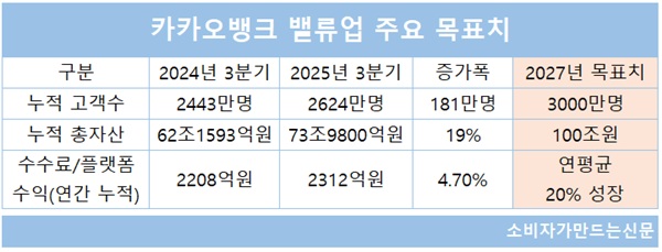 카카오뱅크는 지난해 11월 밸류업 공시를 통해 향후 밸류업 전략을 발표했다. 당시 카카오뱅크는 2027년까지 ▲고객 수 3000만 명 확보 ▲총자산 100조 원 돌파 ▲수수료/플랫폼 수익 연평균 20% 이상 성장 등 3대 목표를 제시했다.