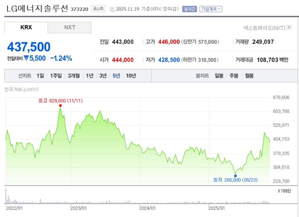 실적 흐름에 따라 LG에너지솔루션 주가 그래프도 비슷한 궤적을 그렸다. 2022년 11월 18일 62만8000원으로 고점을 찍었고, 2023년 10월에는 40만 원 아래로 떨어졌다. 이후 시장 불확실성 속에서 한동안 30만 원대에 머물렀다. 지난 5월에는 26만 원대로 떨어졌으나 현재는 다시 50만 원을 바라보는 수준으로 올라왔다.