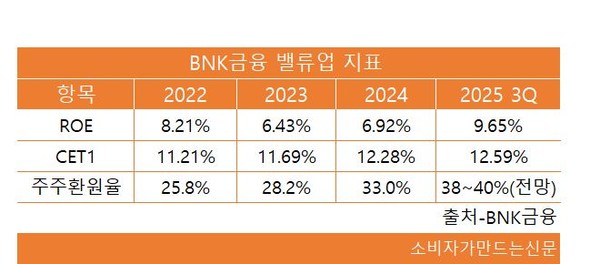 내년 3월 임기 만료를 앞둔 빈대인 BNK금융지주 회장이 임기 동안 수익성과 기업가치 제고 측면에서 준수한 성적표를 받았다. '2027년 ROE 10%'라는 밸류업 목표 달성에도 청신호가 켜졌다.