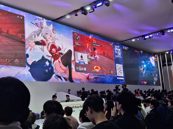 넷마블은 지난 13일 부산 벡스코에서 개막한 지스타 행사장부스에 몬길: 스타다이브 시연대를 마련하고 유명 인플루언서를 초대해 보스 토벌 대전 콘텐츠를 선보였다.