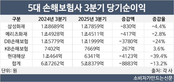14일 각 사 보고서에 따르면 자산규모순 상위 5개 손해보험사의 당기순이익은 전년 대비 13.2% 감소한 5조8379억 원을 기록했다.