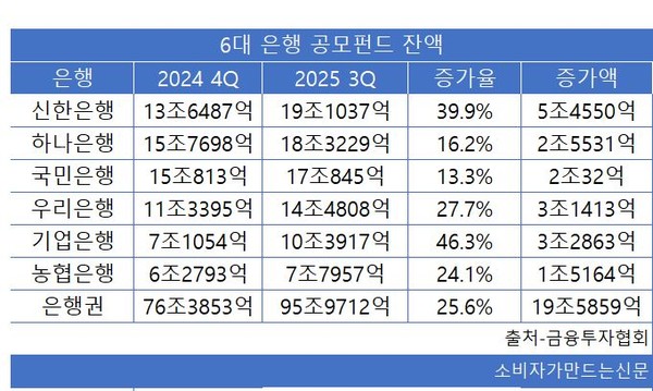 20일 금융투자협회에 따르면 신한은행의 공모펀드 잔고는 작년 말 13조6487억 원에서 올해 3분기 말 기준 19조1037억 원으로 39.9% 증가했다.