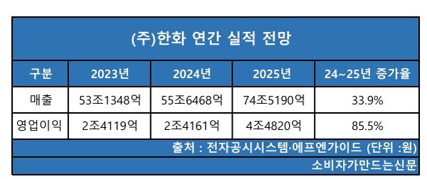 26일 금융정보업체 에프앤가이드에 따르면 ㈜한화는 올해 매출이 74조5190억 원으로 전년 대비 33.9% 증가할 전망이다. 영업이익은 4조4820억 원으로 85.5% 늘어난다.