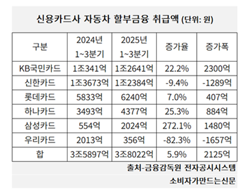 26일 금융감독원 전자공시시스템에 따르면 전업 카드사 6곳의 3분기 누적 자동차 할부금융 취급액은 3조8022억 원으로 전년 동기 대비 5.9% 증가했다.