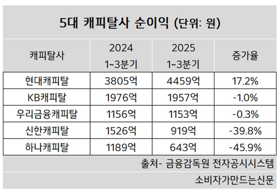 현대캐피탈의 3분기 누적 순이익은 4459억 원으로 전년 동기 대비 17.2% 증가했다. 자산규모 상위 5대 캐피탈사 중 순이익이 증가한 곳은 현대캐피탈이 유일하다.