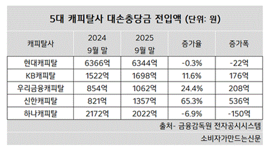 올해 9월 말 기준 KB캐피탈의 대손충당금 전입액은 1698억 원으로 전년 동기 1522억 원 대비 11.6% 증가했고 우리금융캐피탈 역시 같은 기간 854억 원에서 1062억 원으로 24.4% 늘었다.