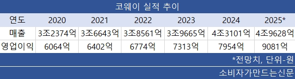 증권가에서는 코웨이의 올해 매출이 5조 원에 육박할 것으로 전망한다. 영업이익도 9000억 원 이상이다. 전망치가 실현되면 2020년부터 이어지는 매출, 영업이익 역대 최대 행진 기간이 6년으로 늘어나게 된다.