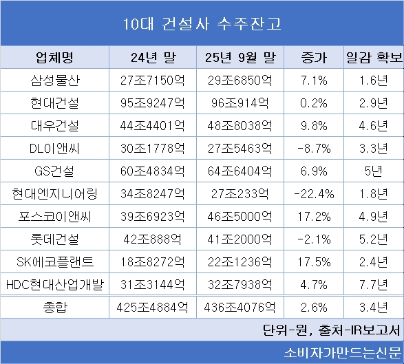 28일 업계에 따르면 10대 건설사의 올해 9월 말 기준 수주잔고는 총 436조4076억 원으로 집계됐다. 전년 말 대비 2.6% 증가한 수치다. 지난해 매출과 비교한 평균 확보 일감은 3.4년으로 나타났다.