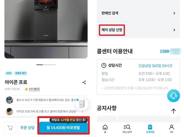 LG전자와 코웨이는 앱 내에서 직접 해지 신청이 가능하나 위약금, 제품 회수 등을 위해 상담원과의 연결이 반드시 필요하다. 코웨이도 마찬가지다.