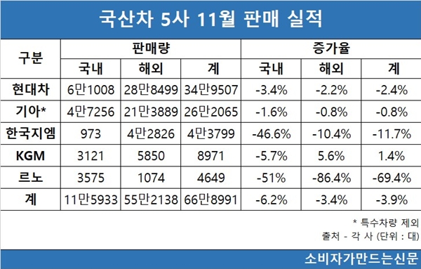 KG모빌리티만 유일하게 판매량이 증가했다. 현대자동차, 기아, 한국지엠, 르노코리아는 국내와 해외 판매량이 모두 감소했다.
