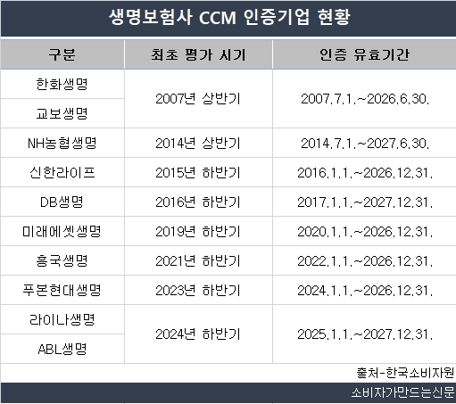 이 외에도 △미래에셋생명(7년) △흥국생명(5년) △푸본현대생명(3년) △라이나생명(3년) △ABL생명(3년) 등이 CCM 인증을 받았다.