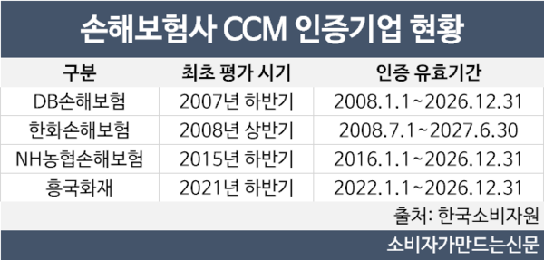 DB손해보험이 손보업계 최초 CCM 인증을 받은 후 19년간 유지하며 소비자 중심 경영을 견고히 하고 있다. 한화손해보험 또한 19년 연속 CCM 인증을 받고 있으며 NH농협손해보험도 10년 연속 소비자를 위한 경영에 집중하고 있다.
