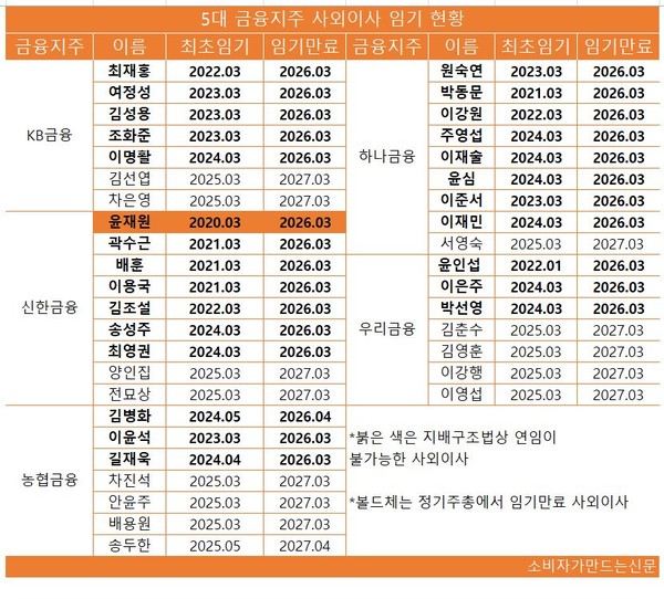 다만 금융회사 지배구조법상 보장된 사외이사 최대 임기 6년을 모두 채우거나 각 사 내규에 따라 연임이 불가능한 사외이사는 신한금융지주 사외이사인 윤재원 이사 1명이다. 윤 이사는 현재 신한금융지주 이사회 의장도 맡고 있다.