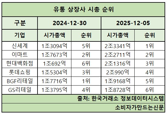 9일 한국거래소에 따르면 시총 1조 원 이상 유통 상장사 6곳 가운데 올해 시총이 가장 큰 기업은 신세계로 2조3341억 원을 기록했다. 이어 이마트(대표 한채양), 현대백화점, 롯데쇼핑(대표 신동빈·김원재)도 2조 원 이상으로 집계됐다.