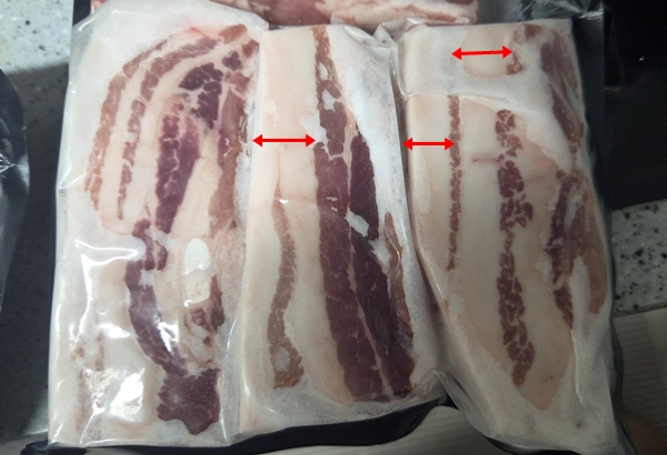 살과 비계가 고르지 않게 분포돼 있고 살코기보다 지방이 더 두꺼웠다. 잘라내야 할 것 같은 비곗덩어리도 상당 부분을 차지했다.