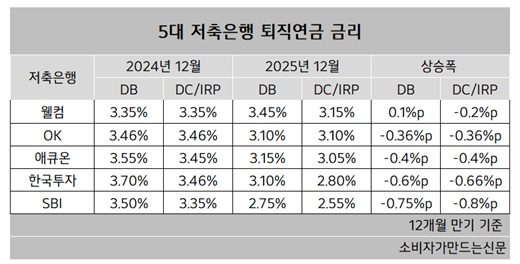 반면 웰컴저축은행(대표 김대웅)의 DB형은 유일하게 금리가 올랐다. DB형은 3.45%로 0.1%포인트 상승했다. DC형과 IRP형은 3.15%로 0.2%포인트 떨어졌다.