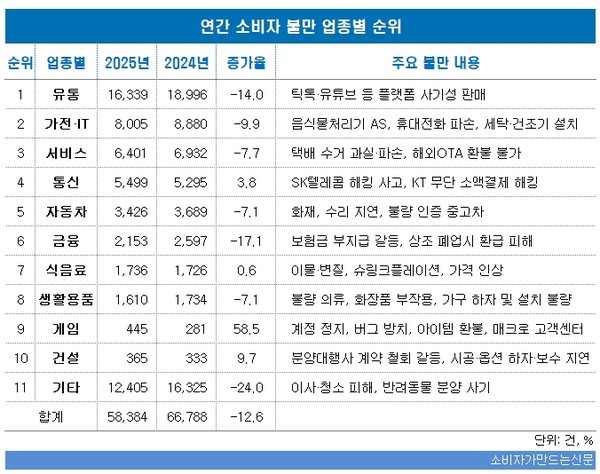 소비자고발센터에 제기된 올 1~11월 소비자 민원은 총 5만8384건으로 통계에 따르면 민원이 많은 업종은 유통→가전·IT→서비스→통신→자동차→금융→식음료→생활용품→게임→건설 순이다.