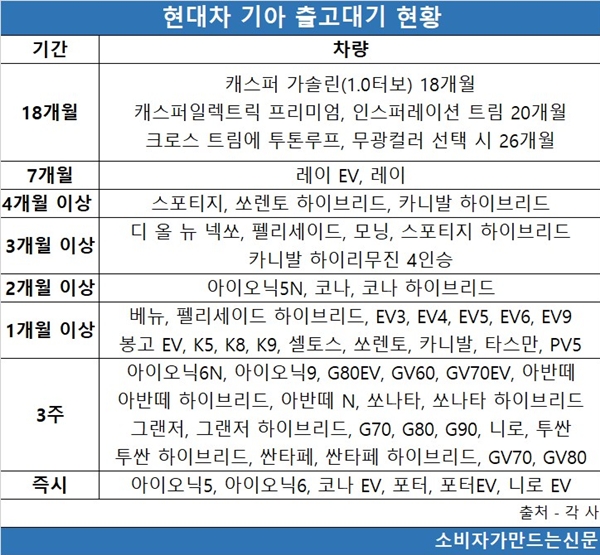11일 현대차와 기아가 지점 딜러들에 배포한 올해 12월 납기표에 따르면 출고 대기 기간이 가장 긴 차량은 캐스퍼 가솔린 1.0터보로 18개월이 걸린다. 특정 컬러와 옵션을 더할 경우 출고 대기 기간은 26개월까지 늘어난다.