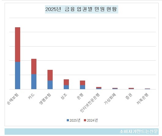 카드사에 제기된 민원도 전체의 25%를 차지하며 높은 비중을 보였다. 그 외에 상조, 은행, 인터넷전문은행은 한자릿수 비중을 차지했고 가상화폐거래소, 증권, 저축은행은 1% 미만이었다.