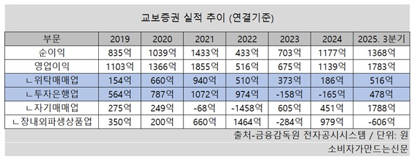 3분기까지 교보증권의 연결 기준 영업이익은 1783억 원, 순이익은 1368억 원으로 전년 동기 대비 각각 14.6%, 2.9% 증가했다. 영업이익은 이미 지난해 연간치를 크게 웃돌았다.