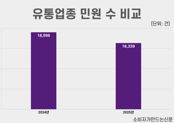 올해 1월1일부터 11월30일까지 소비자고발센터(www.goso.co.kr)에 제기된 유통 민원은 1만6339건으로 지난해 같은 기간(1만8996건)보다 14% 감소했다. 민원 건수는 줄었지만 주요 업종 중 유일하게 1만 건 이상 집계되며 11년 연속 민원 1위의 불명예를 안았다. 온라인 소비의 일상화로 거래 건수가 증가한 측면을 고려하더라도 소비자 불편이 그만큼 일상적으로 반복되고 있음을 보여준다.