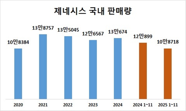 제네시스의 올해 총 판매량이 11월까지 5% 감소하면서 6년 만에 20만 대 미만 판매량을 기록할 것으로 보인다.
