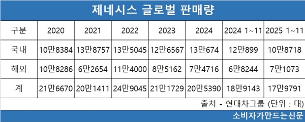 제네시스 글로벌 판매량도 2022년 24만9045대를 기록한 이후 2023년 21만1729대, 2024년 20만5390대로 판매량이 매년 줄었다. 올해는 20만대 이하를 기록할 것으로 전망된다. 2019년 7만7135대 이후 6년 만이다.