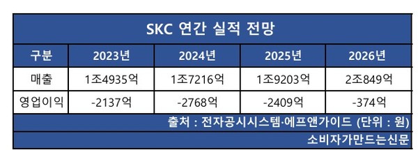 그러나 100%에 육박하는 매출 원가율이 지속되면서 SKC의 적자 규모는 2배 이상 커졌다. 2026년 역시 적자에서 탈출하기 어려울 것이란 전망이 나온다.