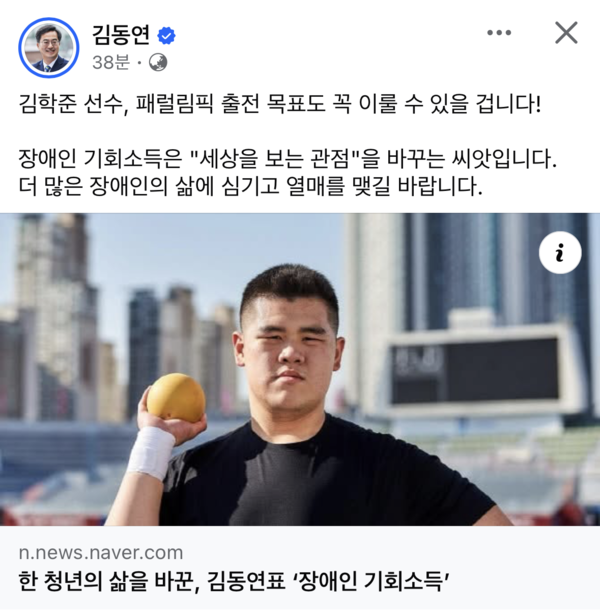 지난 10월 제45회 전국장애인체육대회 포환던지기에서 동메달을 수상한 김학준 선수(22)가 주인공이다. 그에게 경기도 장애인 기회소득은 ‘인생의 계획표’가 됐다.