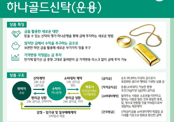 하나골드신탁 상품은 보유한 금 실물을 하나은행에 맡기면 만기에 감정가의 약 1.5%에 해당하는 운용수익을 금 실물과 함께 돌려받는 형식이다. 운용수익은 금전으로 지급된다.