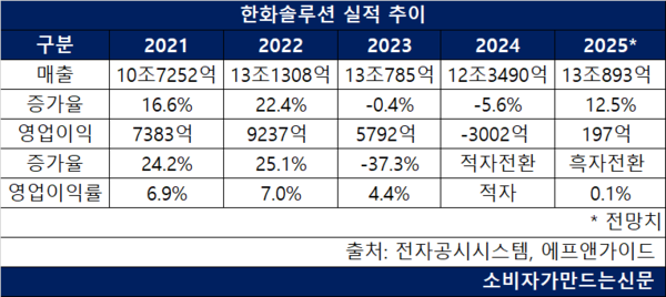 18일 금융정보업체 에프앤가이드에 따르면 한화솔루션의 올해 매출은 13조893억 원, 영업이익은 197억 원으로 전망된다. 전년 대비 매출은 12.5% 증가했고 영업이익은 흑자 전환이 예상된다.