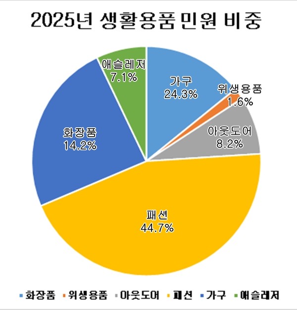 아웃도어, 패션업 및 가구 민원이 감소한 가운데 애슬레저와 화장품, 위생용품 등 품목에서는 오히려 민원이 두자릿수 비율로 증가했다. 소비 패턴이 변화하면서 품목별 민원 흐름이 뚜렷하게 엇갈린 것으로 분석된다.