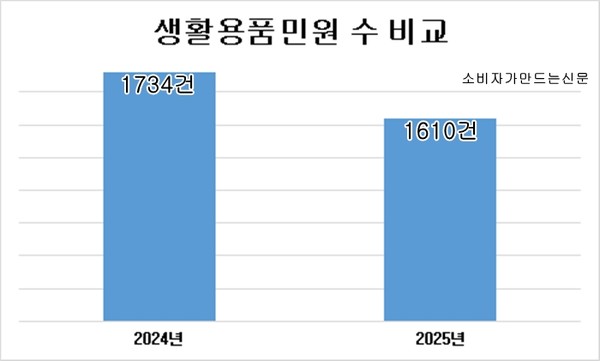 올해 1월1일부터 11월30일까지 소비자고발센터(www.goso.co.kr)에 제기된 생활용품 민원은 총 1610건으로 지난해 같은 기간(1734건)보다 7.1% 감소했다.