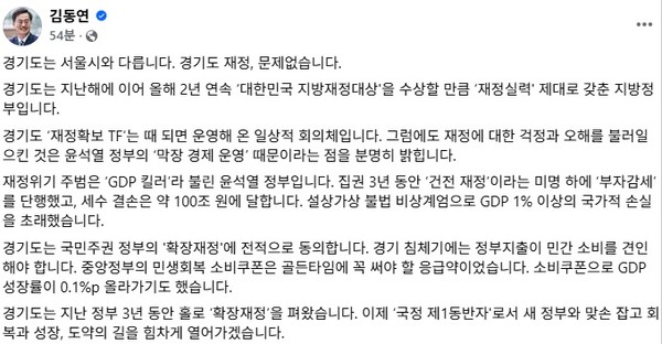 18일 김 지사는 페이스북을 통해 “경기도는 지난해에 이어 올해까지 2년 연속 ‘대한민국 지방재정대상’을 수상할 만큼 재정 역량을 갖춘 지방정부”라며 "‘재정확보 TF’는 때 되면 운영해 온 일상적 회의체다. 이를 두고 재정 위기 신호로 해석하는 것은 과도한 우려”라고 말했다.