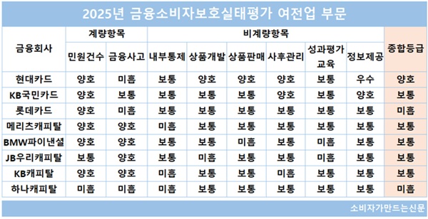 반면 롯데카드와 하나캐피탈은 각각 대규모 개인정보 유출 피해, 공격적인 팩토링 영업에 따른 민원 급증과 소비자보호총괄책임자(CCO) 겸직 문제가 지적돼 ‘미흡’ 등급을 받으며 지난 평가보다 등급이 내려갔다.