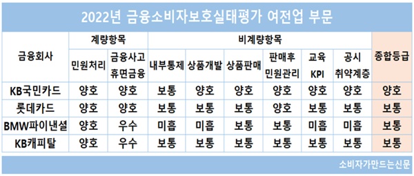 KB국민카드는 2022년 평가에서 6개 비계량 지표 중 5개 부문이 ‘양호’, 1개가 ‘보통’을 받아 종합등급 '양호'를 받았지만 올해는 ‘양호’가 2개로 줄고 나머지 전 부문이 ‘보통’을 받으며 종합등급이 '보통'에 그쳤다.