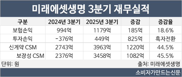 신계약 CSM 또한 증가했다. 올해 3분기 미래에셋생명의 신계약 CSM은 3963억 원으로 전년 동기 대비 44.5% 늘었다. 그중 보장성보험의 신계약 CSM은 3458억 원으로 미래에셋생명이 상품 포트폴리오를 보장성보험 위주로 강화한 것으로 분석된다.