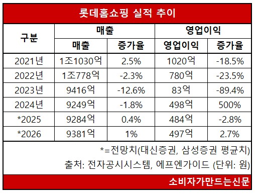 31일 증권가에 따르면 롯데홈쇼핑은 올해 매출 9284억 원, 영업이익 484억 원의 실적을 기록할 전망이다. 전년 대비 매출은 0.3% 증가하지만, 영업이익은 2.8% 감소하는 수치다.
