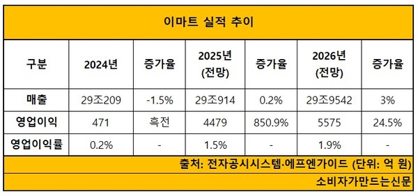 2일 증권가에 따르면 이마트의 2025년 매출은 29조914억 원, 영업이익은 4479억 원을 기록할 것으로 전망된다. 전년 대비 매출은 0.2% 증가하지만 영업이익은 850%나 늘어난다.