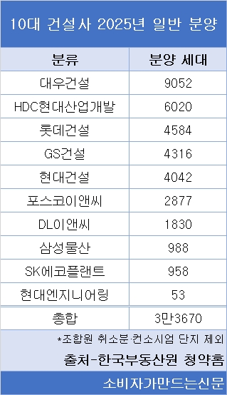 가장 많은 물량을 공급한 곳은 대우건설이다. 대우건설은 올해 9052세대를 분양하며 10대 건설사 가운데 유일하게 9000세대를 넘겼다. 용인 푸르지오 원클러스터 2·3단지, 서면 써밋 더뉴, 풍무역 푸르지오 더 마크 등 대규모 단지를 중심으로 공급을 확대했다.