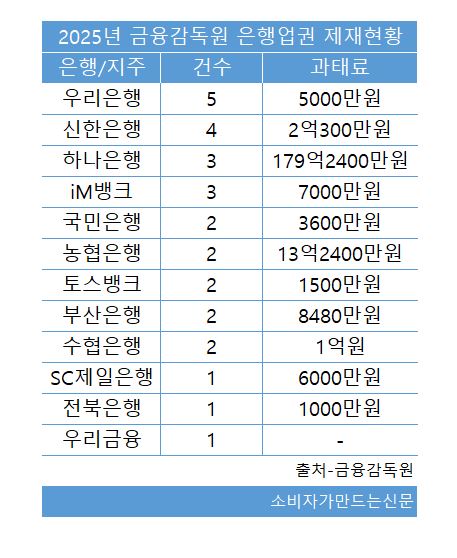 금감원 제재, 우리은행 '기관주의' 포함 5건 최다...하나은행은 과태료 179억 달해