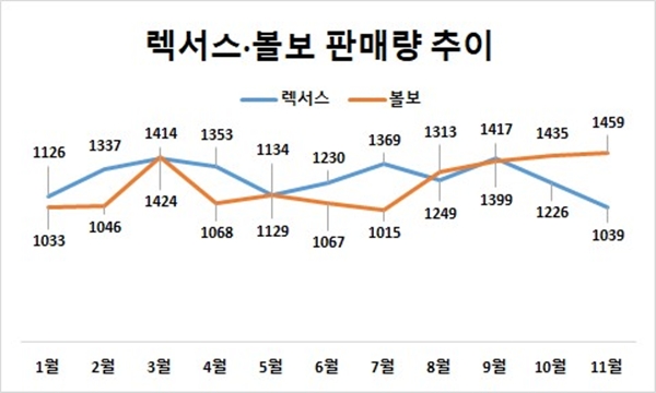 지난해 11월까지 렉서스와 볼보의 판매량 격차는 506대에 불과하다.