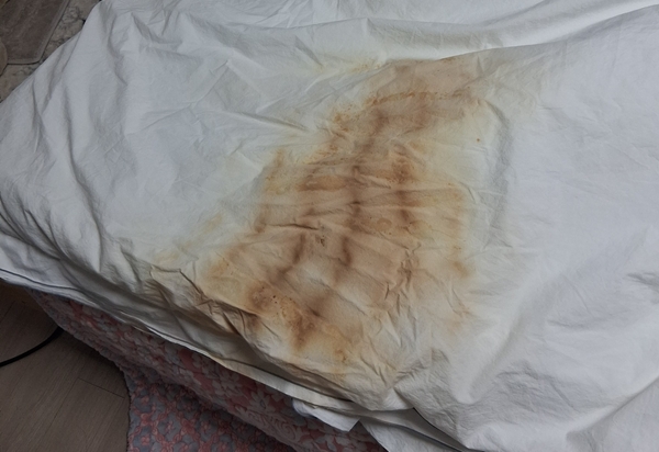 전기방석을 침실 침대에서 사용하던 중 너무 뜨거워 이불을 걷어보니 매트리스까지 방석 열선 모양대로 그을려 있었다. 모르고 뒀더라면 대형 화재로 번질 수도 있던 상황이었다.