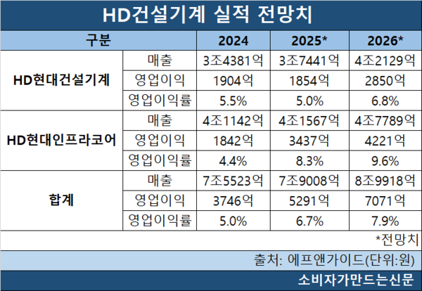 HD현대건설기계는 올해 매출이 12.5%, 영업이익은 53.7% 증가할 것으로 보인다. HD현대인프라코어 역시 매출은 14.9%, 영업이익은 22.8% 증가할 전망이다.