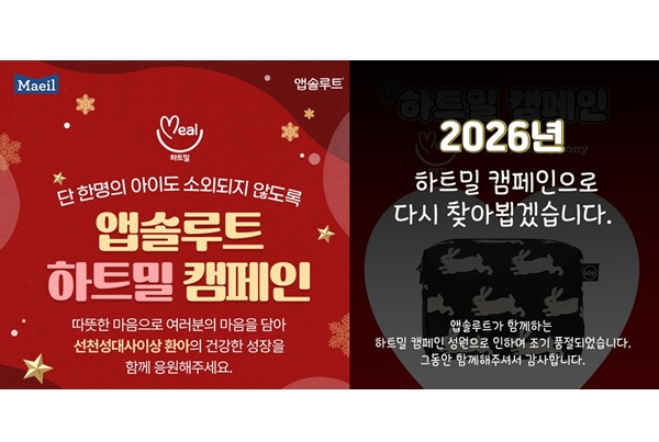 매일유업 관계자는 “앱솔루트 하트밀 캠페인 굿즈의 조기 완판은 요즘 소비자들이 일상 속에서 누군가를 응원하기 위한 가치소비에 관심이 높고, 적극적으로 동참하고 있다는 것을 보여준다. 앞으로도 소비자와 함께 완성할 수 있는 공익적인 활동들을 지속해 나갈 것”이라고 말했다.