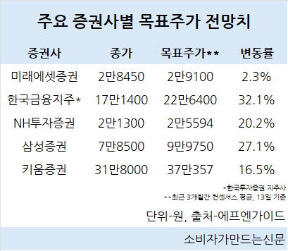 한국투자증권(대표 김성환) 지주사인 한국금융지주는 13일 종가 대비 32.1% 상승한 22만6400원으로 목표주가가 매겨졌으며 NH투자증권도 20.2% 오른 2만5594원으로 책정됐다.
