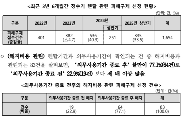 아울러 소비자에게는 렌탈 계약 시 렌탈기간과 의무사용기간을 확인하고, 렌탈 계약 중도 해지에 따라 부담해야 할 비용을 확인할 것을 당부했다.