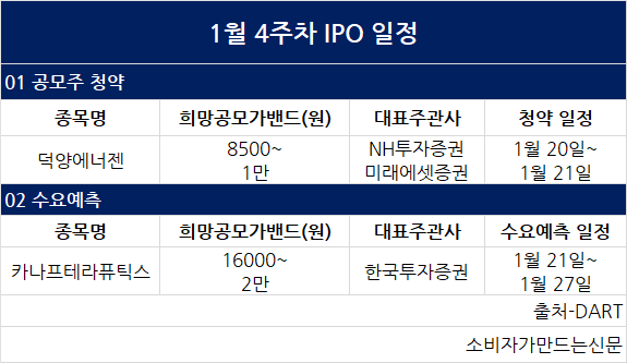 수소 정제 업체 덕양에너젠은 1월 20일과 21일 양일간 코스닥 상장을 위한 공모청약을 실시한다. 희망공모가는 8500원~1만 원으로 19일 공모가액이 확정된다. 공동대표주관사는 NH투자증권과 미래에셋증권이다.